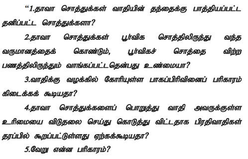 The fact of the case is that the plaint schedule properties are owned by Veerapa Gounder. The first defendant and the plaintiff are brother and sister. The second defendant is the son of the first defendant. Nallamal is the wife of Veerapa Gounder. The property is the self acquired property of Veerappa Gounder. Veerappa Gounder has died intestate. Therefore, his legal heirs Nallammal and the plaintiff and the first defendant are entitled to the properties. Nallammal has also died intestate leaving the plaintiff and the first defendant as the legal heirs. Since the property is the