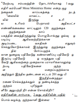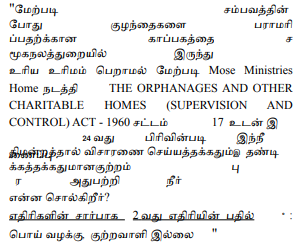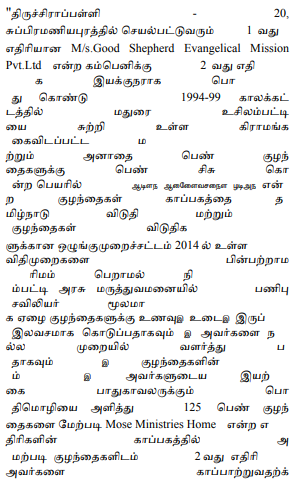 2. The petitioners' case is that the first petitioner is a Company, M/s.Good Shepherd Evangelical Mission Pvt. Ltd. and the second petitioner is the Director of the said Company and also a pastor. The petitioner runs a destitute home for children functioning as Mose Ministries in Trichy Town, Tamil Nadu. Permission was granted by the District Collector to run the home. The home is running as a charity giving food, shelter and education to the destitute and abandoned children. While so, in the year 2015, the District Social Welfare Officer refused to give registration of the institution as per the Juvenile Justice (Care and Protection) Act, 2015 and the Tamil Nadu Hostels and Homes for Women and Children (Regulation) Act, 2014. The home, therefore, was constrained to file W.P.(MD). No.16723 of 2015.