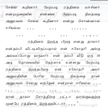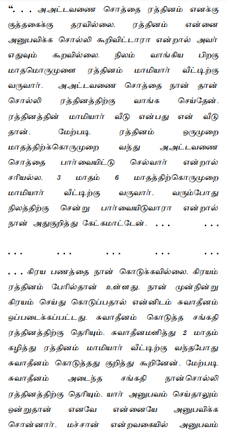 3. According to the plaintiffs, the first plaintiff's husband is Rathinam, and the plaintiffs 2 and 3 are their sons. The defendant is the first plaintiff’s brother. Suit Property was purchased by the first plaintiff's husband - Rathinam vide Sale Deed dated December 5, 1972 and he was in possession and enjoyment till his demise in 1993. Thereafter the plaintiffs are in its possession and enjoyment. The plaintiffs are residing in Pallipatty Village while the Suit Property is situate in Eachampadi Village which is 50 Kms away from the said Pallipatty Village. The defendant is residing in Eachampadi Village has been maintaining the Suit Property and payi