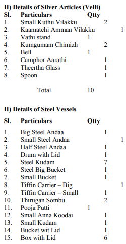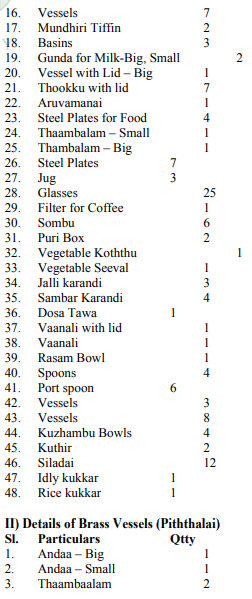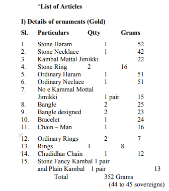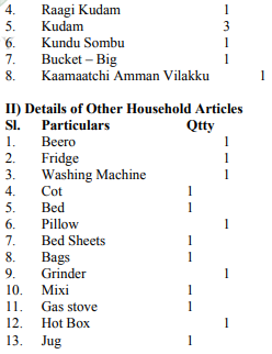 5. The wife entered appearance and stated that respondent/husband was the one who used to treat her cruelly and used to assault her physically and emotionally. She pleaded that several attempts had been made towards resolution, but it was of no avail. Just prior to the proceedings, a complaint was lodged with All Women Police Station at Ranipet. On 11.01.2012, the husband appeared gave a voluntary statement that he has in his custody. The following articles bel