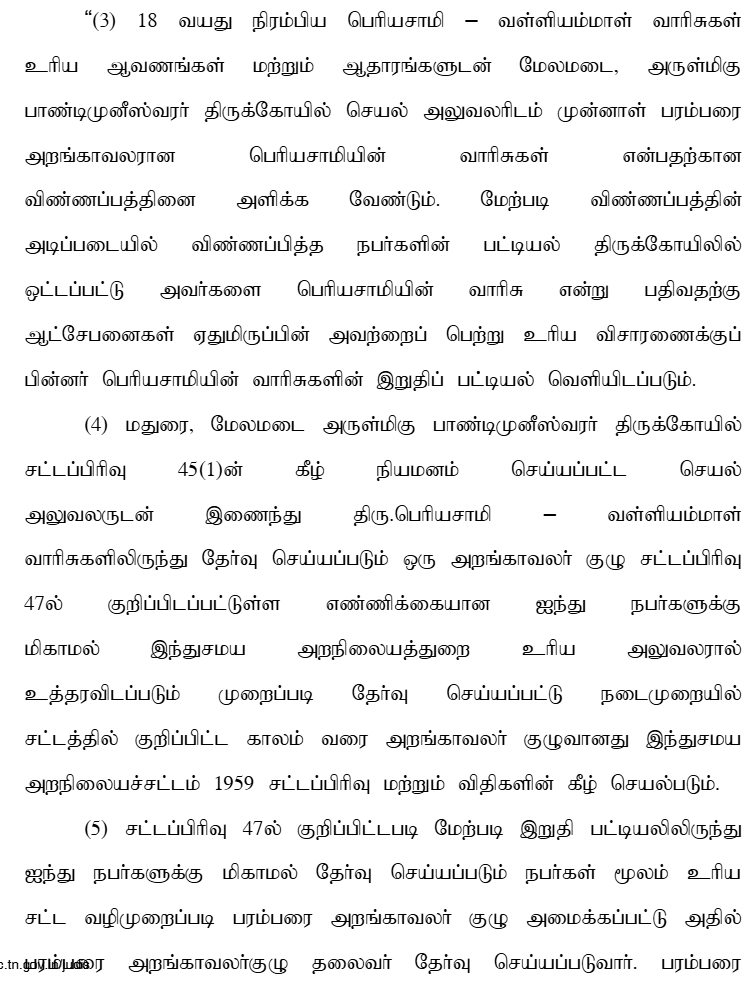 Committee of Administrators, Arulmighu Pandi Muneeswarar Temple, Melamadai, Madurai North Taluk, Madurai District, Rep. by its Member, R. Lakshmi – Respondent