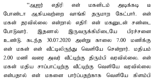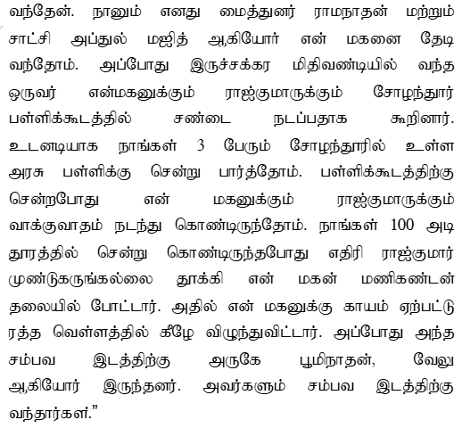 2. The case of the prosecution is that the deceased and the accused were friends. The deceased was an operator of a JCB, and the accused used to work with him. On 30.07.2020, at about 10.30 a.m., while the accused was having his breakfast at Hotel Sumaiah Amma, the deceased arrived and teased the accused, asking if he would buy borota for him. This led to a worsening of the enmity between them. Later on the same day, at about 02.30 p.m., when the deceased was resting in the veranda of a building located on the north side of the Government High School at Chozhandhur, the accused struck the deceased's head with a granite stone with the intention to kill him. As a result, the deceased sustained fatal injuries and died on the spot.