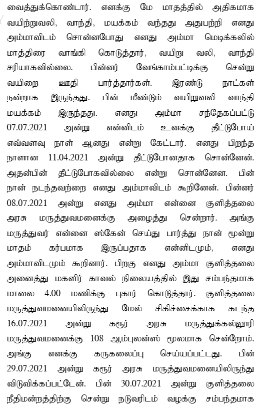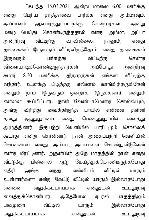 2. The case of the prosecution is that, the minor victim girl was aged about 15 years. She was studying 11th standard and the accused is being a neighbour of the victim girl aged about 37 years. When the parents of the victim girl went out, during the month of March 2021, the accused came to her house and committed the offence of penetrative sexual assault. The accused also continued to do the same, while the victim girl was alone at her house during Covid-19 lock-down. Thereafter, the victim became pregnant and suffered from stomach pain. Thereafter, the victim girl disclosed the offence committed by the accused and lodged a complaint.