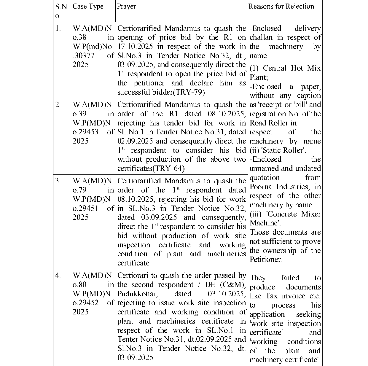 the appellants are Class-I Contractors under the Highways Department. They have applied for work contract in respect of Pudukottai (H) C&M Division CRIDP 2025-2026. Pursuant to the tender notification issued by the first respondent dated 02.09.2025, their applications were considered and rejected on the first stage itself, since the respondents were not satisfied regarding the mandatory possession/ownership of critical plants and machinery to get eligible for pre-qualification. The rejection order clearly specified the plants and machinery for which the appellants were not able to produce acceptable proof of ownership.