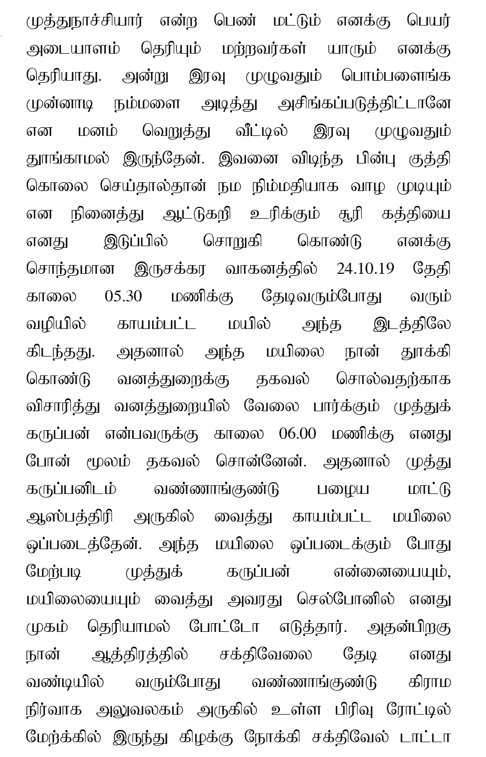 3.On the next day ie., 24.10.2019, the deceased left his house to attend to his business in his vehicle. At about 08.30 a.m., when the deceased stopped his vehicle near the Village Administrative Office, Vannangundu and got down and walked on the road, the accused came there and stopped him. He confronted the deceased and picked up a quarrel regarding the earlier incident. Two passers by had witnessed the quarrel and pacified them. Thereafter, they went to tea shop to have tea. When they returned, they saw the deceased lying with injuries on his left chest.