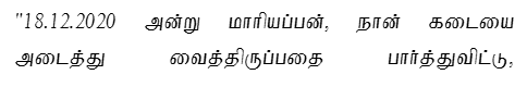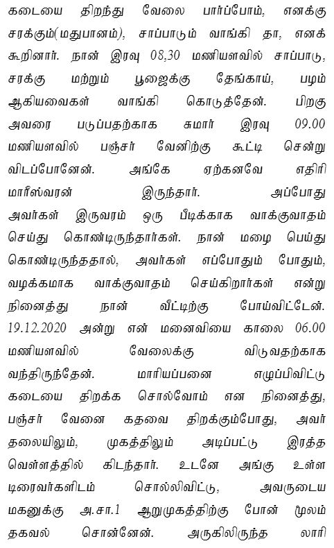 2. The case of the prosecution is that PW1 is the son of the deceased. The deceased was married twice and got separated from both wives and used to stay at the nights in a dismantled mahindra van, which is used for vulcanizing work by PW2, stationed at Mudukkukadu Village, in the Service Road, Southern Side of Byepass Road. While being so, on 18.12.2020 at about 09.30 p.m., when PW2 had gone to his shop for vulcanizing work, he found that the accused, who was working as driver under him and the deceased have involved in wordy altercation over a beedi. Therefore, PW2 did not take it seriously and as such he left to his home. On the next day at about 06.00 a.m. when PW2 had gone to the shop, he found the deceased with injuries. It was immediately informed to PW1. Thereafter, PW1 came to the scene of crime and lodged a complaint.