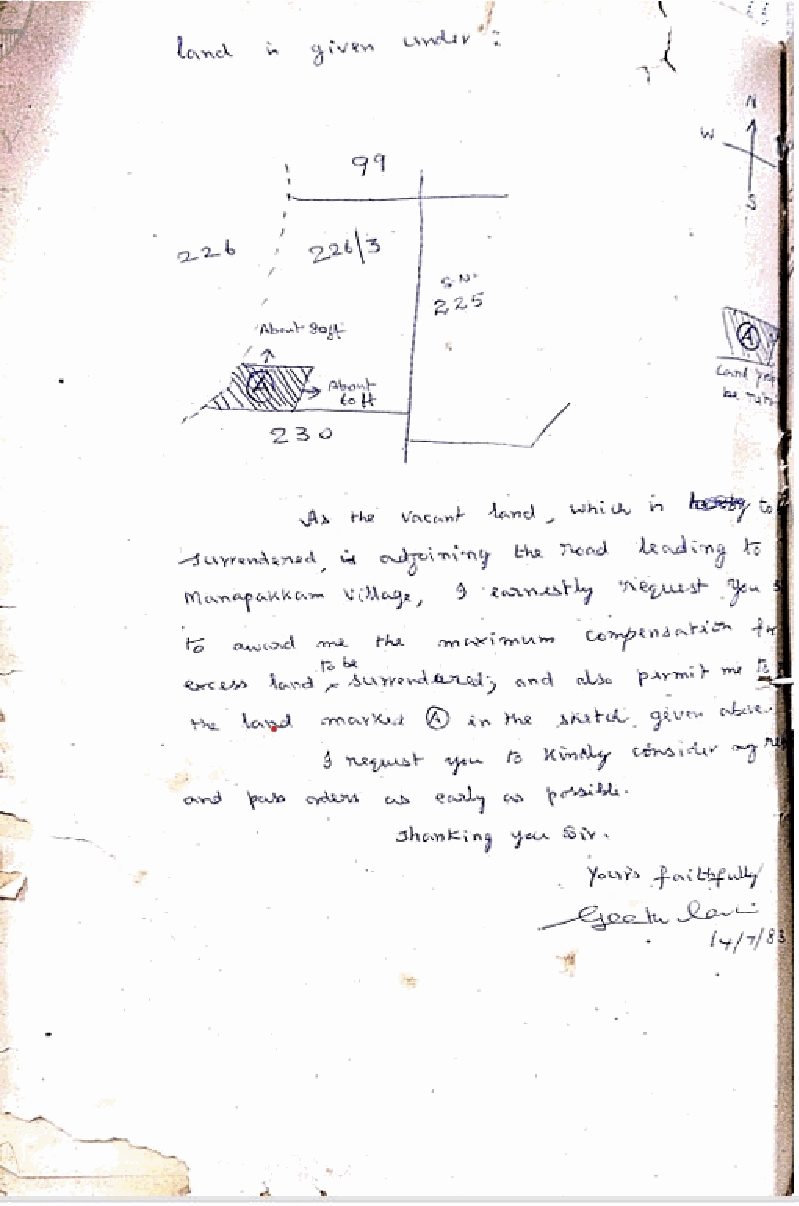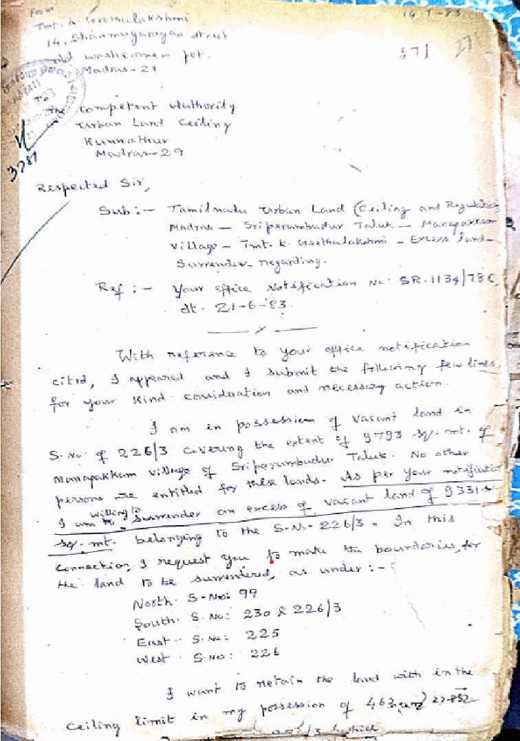 2. The learned Additional Government Pleader for the appellant would submit that excess vacant lands were acquired under the Tamil Nadu Urban Land (Ceiling and Regulation) Act and was allotted to the Tamil Nadu Civil Supplies Corporation as per the G.O.Rt.No.627, Revenue dated 11.07.1996, an extent of 9110 Sq.Mtr in Survey No.226/3B of Manapakkam Village. The urban land owner, Smt.V.Geethalakshmi filed exemption petition before the Secretary to Government Revenue Department. Again, the urban land owner’s husband, K.K.Balaguruvappa filed a petition before the Secretary to Government Revenue Department and it was not considered by the Government. Prior to that, Smt.V.Geethalakshmi filed W.P.Nos.