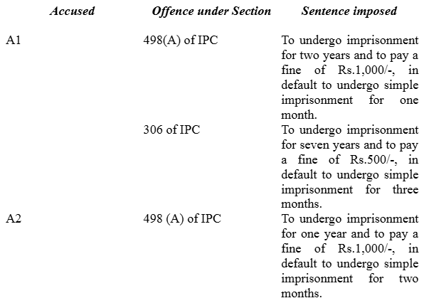 2. (a) The case of the prosecution is that the first appellant/A1/husband of the victim had married the de-facto complainant’s daughter/victim on 19.05.2016, pursuant to a love affair; that the second appellant/mother of the first appellant/mother-in-law of the victim had committed cruelty in various ways; that thereafter, the victim and the first appellant set up a separate matrimonial home; that two weeks before the occurrence since the first appellant had to work on night shifts, he had dropped the victim in the house of P.W.1/mother of the victim; that the second appellant is said to have questioned the victim as to how she could go to her mother’s house instead of coming to the appellants’ house; that on 19.10.2016, the victim had called P.W.1 over phone and had stated that the appellants demanded a sum of Rs.5,00,000/- (Rupees Five Lakhs Only) as dowr