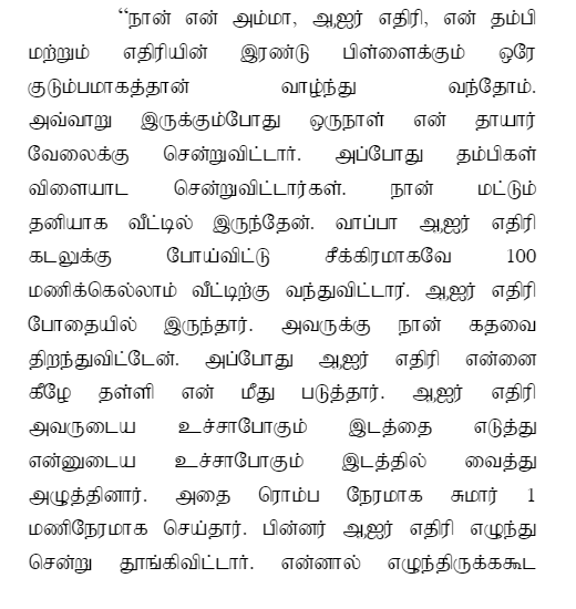 3.While being so, on 07.08.2020 when the victim girl was alone in her house, the accused, who had gone for fishing, returned early in the afternoon at 01.00 p.m. The victim’s mother had also gone for her housemaid work on the date of occurrence. The accused pushed the victim girl and removed her dress and committed penetrative sexual assault on the victim girl. Thereafter, the accused threatened her with dire consequences and war