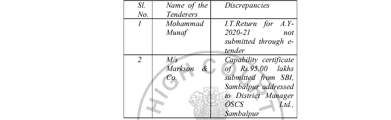 2.1 In the proceeding of the tender committee, it was found that during scrutiny certain discrepancies were noticed in the tender documents furnished by two of the tenderers, namely, opposite parties no.5 and 6. The income tax return for the assessment year 2020-21 was not submitted through e-tender by opposite party no.5, but he had submitted copy of