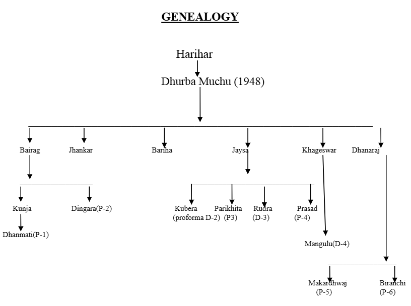 As per the case of the plaintiffs, they (plaintiffs) and proforma defendant nos.2 to 4 are the members of Schedule Tribe community and they belong to one family and their common ancestor was Dhruba Muchu. Dhurba Muchu died leaving behind his six sons, i.e., Bai