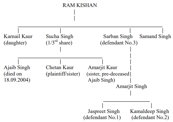 2. The facts of the case as pleaded are, the appellant/plaintiff (hereinafter referred to as 'plaintiff') being represented through LR, filed a suit for possession of 1/3rd share pertaining to Ajaib Singh, son of Sucha Singh in the total land measuring 225 bighas 19 biswas, and for permanent injunction restraining the defendants from selling or encumbering the suit land as well as the houses. Ajaib Singh son of Sucha Singh was real brother of the plaintiff, who died a bachelor on 18.09.2004 leaving behind plaintiff as his only legal representative. The other sister of Ajaib Singh, namely, Amarjit Kaur @ Jeeto predeceased him in the year 1992. After Ajaib Singh's death, the plaintiff is the only successor-in-interest to him. His mother had also predeceased him. When the plaintiff approached halka patwari for entering of mutation in her name, she came to know that suit land already stood entered in the name of defendants No.1 and 2 on the basis of a decree passed in civil suit No.56 of 09.02.1996, decided on 12.03.1996. Ajaib Singh was made to suffer the decree by paying a fraud and he, actua