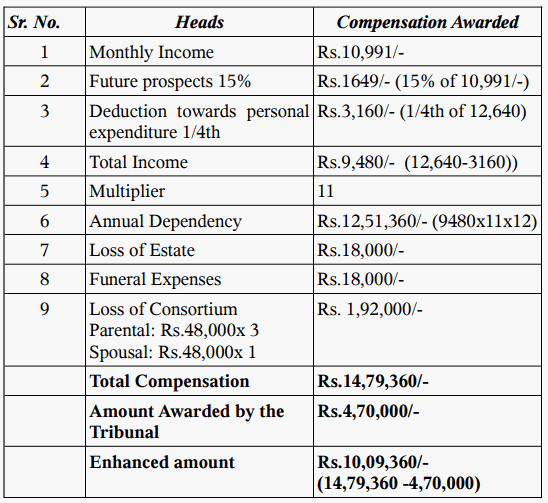 3. The learned counsel for the appellants/claimants contends that the compensation assessed by the learned Tribunal is on the lower side. He further contends that deceased- Mewa Singh was 52 years old at the time of accident and was working as JBT Teacher. He was drawing a salary of Rs.11,000/- per month. He further contends: