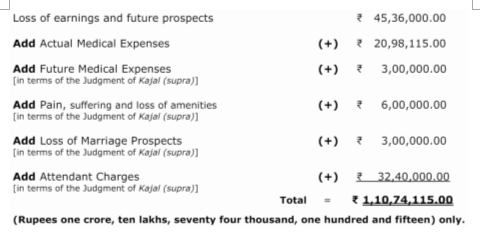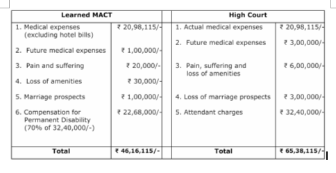 Meenakshi Madan Rai, J. - The quantum of compensation amounting to Rs. 91,52,115/- (Rupees ninety one lakhs, fifty two thousand, one hundred and fifteen) only, awarded by the Learned Motor Accidents Claims Tribunal, Namchi, Sikkim (for short, 'MACT'), in MACT Case No.11 of 2019, dated 30-11-2022 (Yoel Subba vs. National Insurance Company Limited and Others), is assailed in this instant appeal as being excessive and exorbitant.
