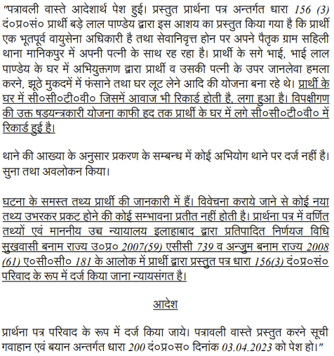 2. By means of the present application, the applicant has assailed the order dated 28.02.2023 passed by Chief Judicial Magistrate, Pratapgarh (in short “trial Court”) in Criminal Misc. Case No. 349 of 2023 (Bade Lal Pandey Vs. Arpan alias Anil Pandey and Another) whereby the trial Court entertained the application preferred by the applicant under Section 156(3) Cr.P.C. as a complaint case. The order impugned, on reproduction, reads as under: