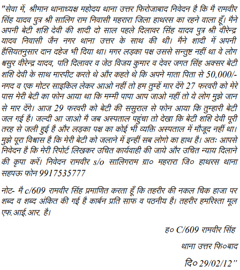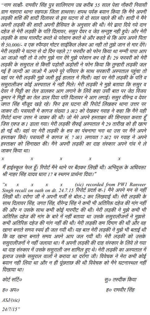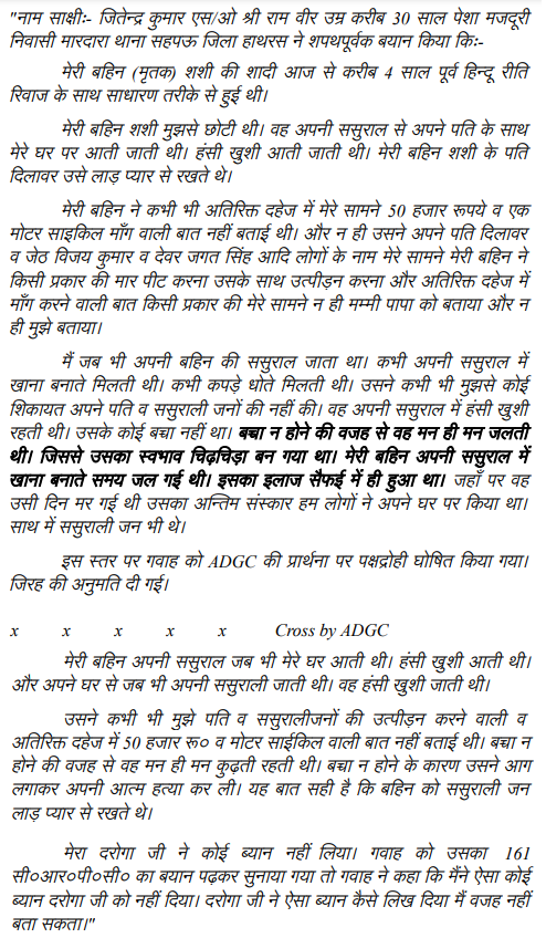 1. The present appeals have been filed against the judgment of conviction dated 9.7.2019 passed by Additional Sessions Judge, Court No. 8, Firozabad in ST No. 392 of 2012 (Case Crime No. 239 of 2012), Police Station – Utter, Firozabad by which the appellants were convicted of charge under Sections 498-A, 304-B IPC, read with Section ¾ of the Dowry Prohibition Act. Accused-appellant, Dilawar Singh, was sentenced to undergo life imprisonment under Section 304-B IPC whereas accused-Jagat Singh and Virendra Singh were sentenced to undergo 10 years of rigorous imprisonment. Under Section 498A of IPC, all the accused were awarded two years of imprisonment with fine of Rs. 5000/- each. In case of default of payment of fine, they were directed to further undergo imprisonment for one month each. Under Section 4 of the Dowry Prohibition Act, the appellants were directed to undergo two years imprisonment with fine of Rs. 5000/- each and in default of payment of fine, they have to undergo one month further imprisonment. All the sentences were ordered to run concurrently.