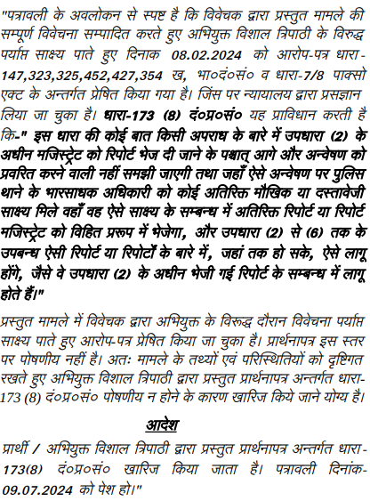3. Present application has been filed by the applicant for quashing of impugned order dated 21.06.2024 passed by the Additional Sessions Judge/Special Judge POCSO Act, Ambedkar Nagar (in short "Trial Court") in S.S.T. No. 66 of 2024 (State vs. Vishal Tripathi and Others), whereby the Trial Court rejected the application seeking prayer to direct the Investigating Officer (I.O.) to conduct re-investigation/further investigation in the matter and the applicant has also sought the prayer to direct for re-investigation/further investigation.