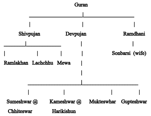2. Brief facts of the case are that one Guran son of Raghunath was recorded tenure holder of the plot in dispute. After death of Guran, name of contesting respondents were ordered to be recorded on the basis of Pa Ka-11 vide order dated 23.02.1990. Petitioners applied for mutation of their names only in place of recorded tenure holder Guran on the basis of succession under Section 34 of U.P. Land Revenue Act. The family pedigree which was given by contesting respondents in their pleading will be relevant in order or appreciate the controversy involved in the matter, which is as under: