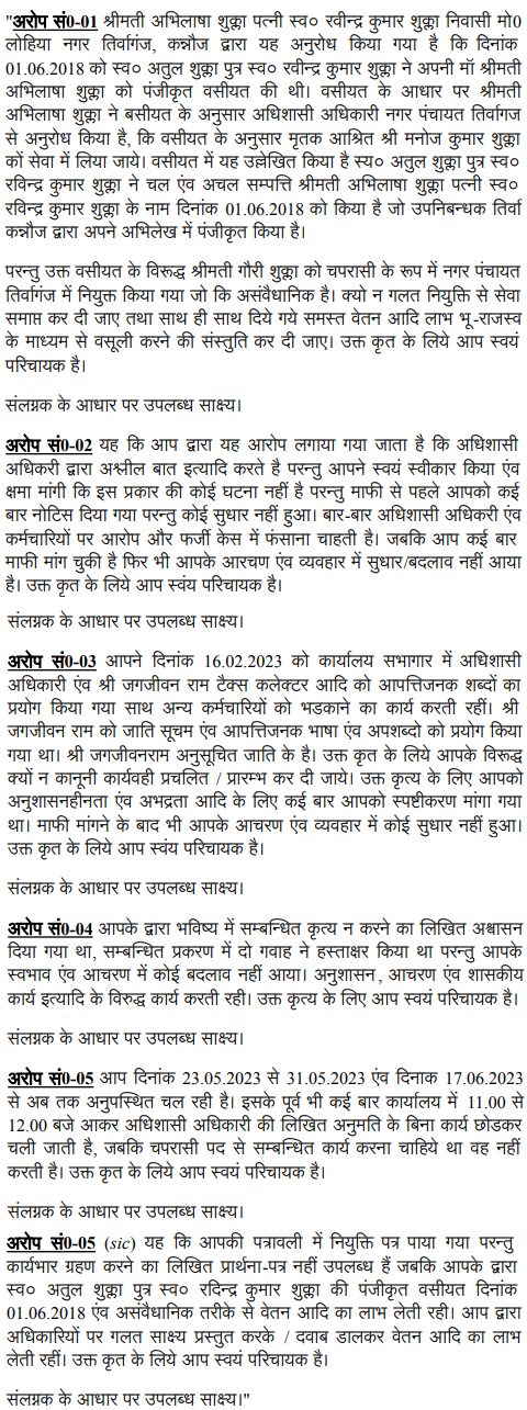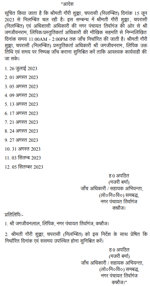This writ petition is directed against an order passed by the Executive Officer, Nagar Panchayat Tirwaganj, District Kannauj dated 29.9.2023, dismissing the petitioner, a Class-IV employee (peon) from service after disciplinary proceedings.