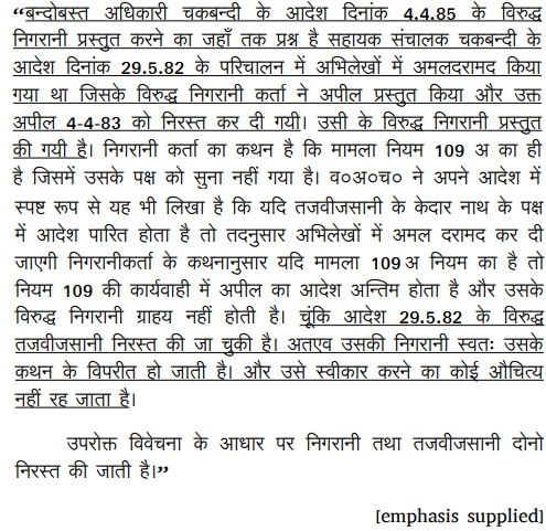 3. The Consolidation Officer by an order dated 23.03.1967 rejected the objections of respondents under Section 9A(2) of Uttar Pradesh Consolidation of Holdings Act, 1953 and entries of basic year were confirmed. Relevant part of the order is quoted below -: