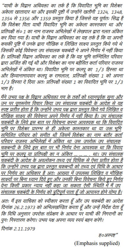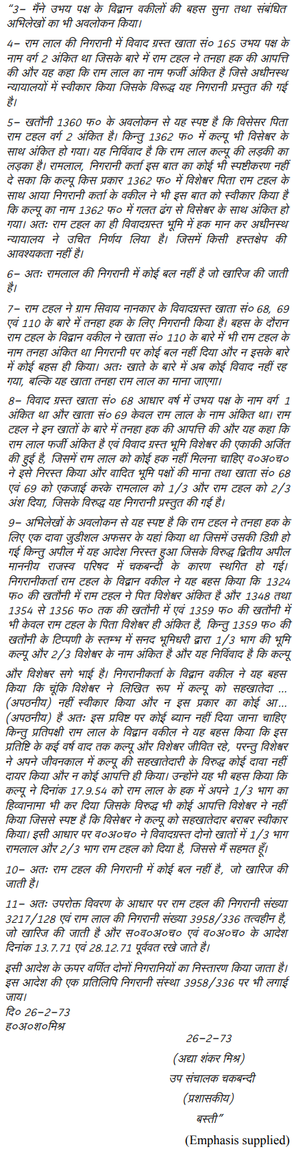 3. During consolidation, original petitioner Ram Lal filed an objection that land in dispute was acquired jointly by Bisheswar, Nageswar and Kalpu, who were brothers and sons of Parsu but Bisheswar being eldest of them and also being head of family, therefore, only his name was got recorded in the revenue record, whereas all were in cultivatory possession of land in dispute.