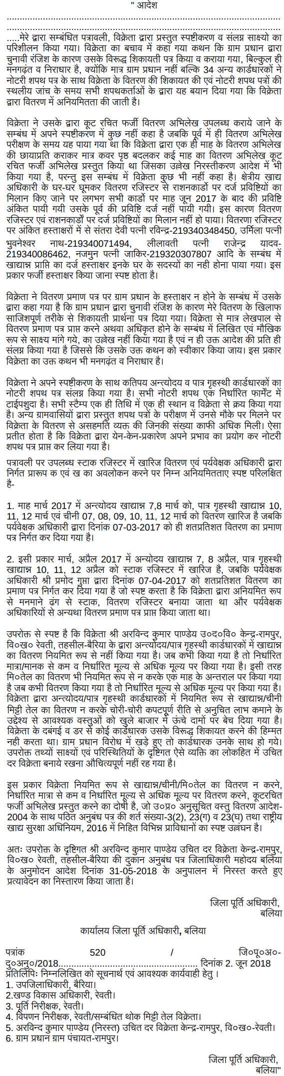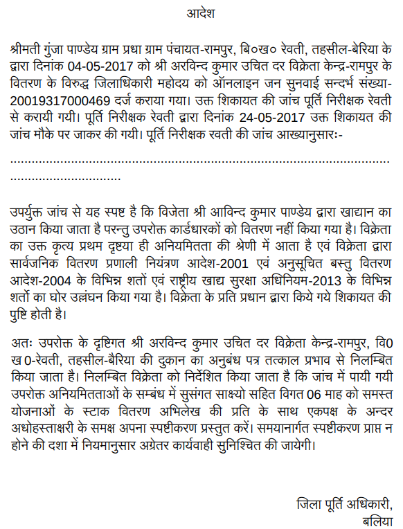 2. Brief facts of the case are that petitioner was granted license to run the fair price shop in Village-Rampur, Block-Rewati, Tehsil-Bairia, District-Ballia. Smt.Gunja Pandey-Gram Pradhan filed a complaint against the petitioner before the District Magistrate in respect of running the fair price shop by the petitioner, accordingly, an inquiry was conducted by District Supply Officer, Rewati, Ballia and vide order dated 27.05.2017 the fair price shop license of the petitioner was suspended. In pursuance of suspension order an explanation was called from the petitioner accordingly, reply was submitted by the petitioner on 22.6.2017 along with affidavit of card holders, statements, proof of distribution of essential commodities to the card holders and registration etc. Respondent No.4/ District Supply Officer, Ballia, vide order dated 25.07.2017, cancelled the fair price shop license of the pe