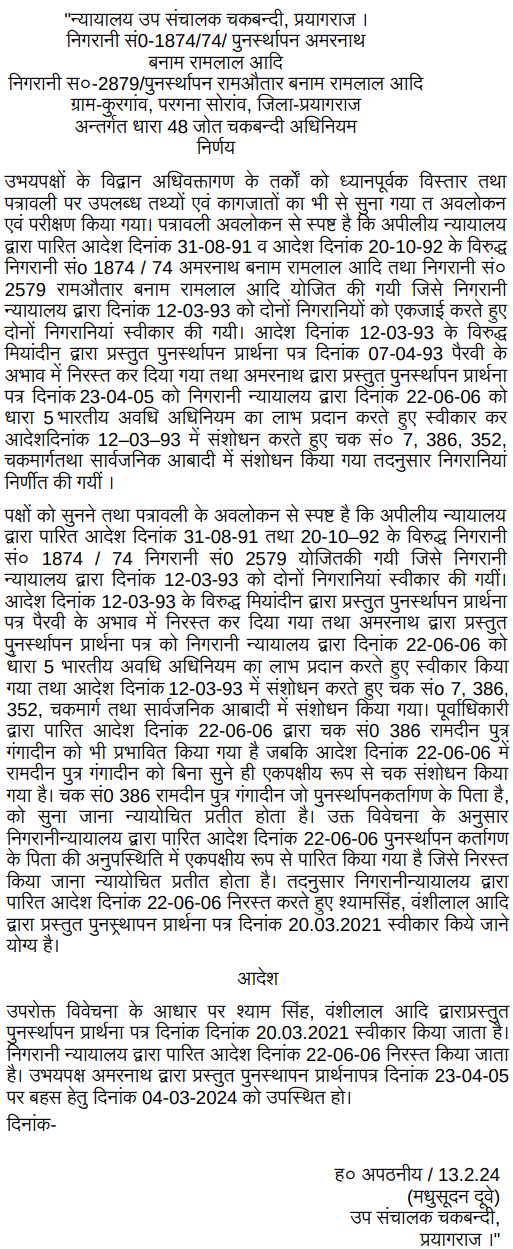 2.Brief facts of the case are that two separate revision filed by petitioner as well as one Ram Autar were allowed by Deputy Director of Consolidation vide common order dated 12.03.1993. Against the order dated 12.03.1993 a restoration application was filed by the petitioner on 23/ 25.04.2005 along with separate application for condonation of delay. Deputy Director of Consolidation vide order dated 22.06.2006 granted benefit of Section 5 of Limitation Act as well as allowed the restoration application dated 23/ 25.04.2005 filed by petitioner and modified the earlier order dated 12.03.1993 to the extent of allotment of plot No.486, 487 and 486 to the petitioner affecting the interest of respondent Nos.4, 5 and 6 and reserved certain area of the aforementioned plot as chak marg. Against the order dated 22.06.2006 restoration application dated 20.03.2021 has been filed by respondent Nos.4, 5 and 6 along with prayer for condonation of delay for recall