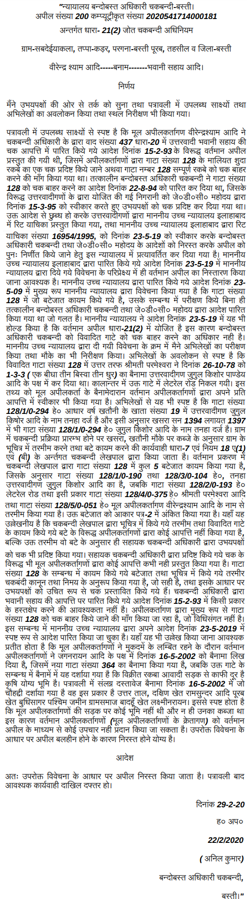 The court upheld the legality of the consolidation process, confirming that the Settlement Officer acted within jurisdiction and properly recorded findings regarding the division of the disputed plot....