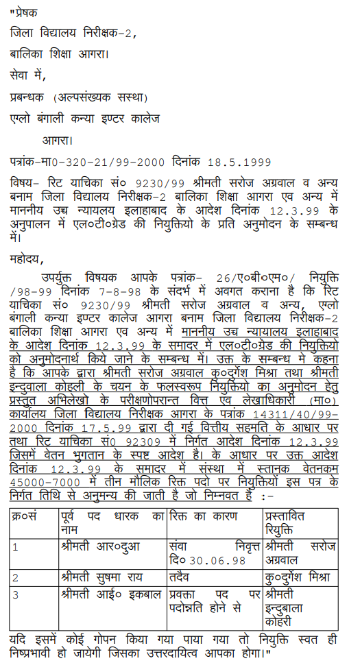 1. The petitioners have set up a case that respondent, a minority institution, has issued an advertisement to fill up three substantive vacancies for the post of Assistant Teachers LT grade. The petitioners have applied for the said post and were duly appointed and in pursuance of their respective appointment letters, they joined service on 1st August 1998. Further case is that Committee of Management of concerned institution have submitted the documents to concerned DIOS for approval on 7th August 1998.