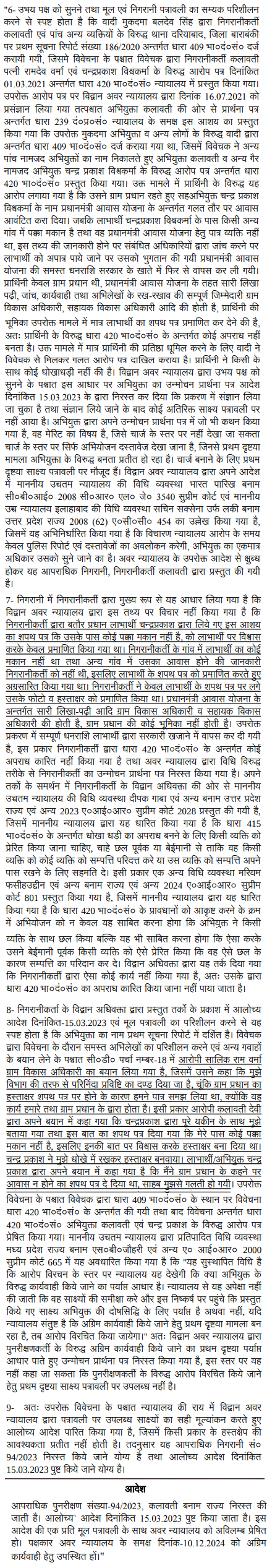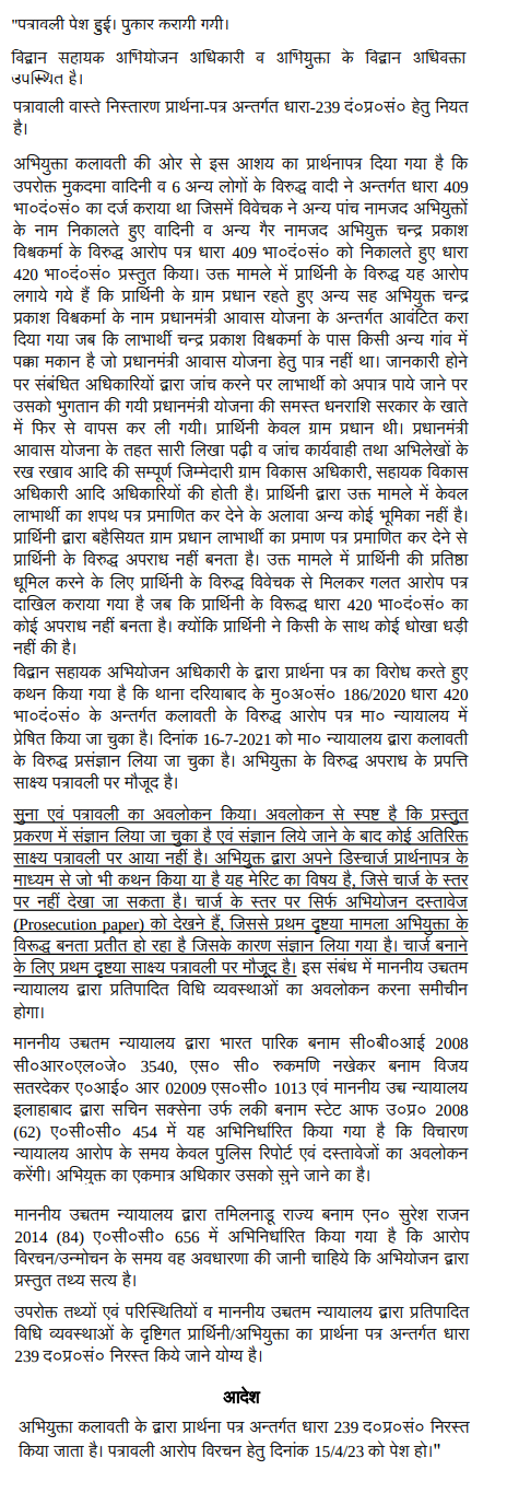 II. Impugned order 15.03.2023, passed by Additional Chief Judicial Magistrate, Barabanki (Room No.25), on Case Crime No.186/2020, under Section 420 Indian Penal Code, Police Station Dariyabad, District Barabanki, contained in Annexure No.2 to this petition. The application for discharge filed by the Petitioner under Section 239 Cr.P.C. may be allowed and the Petitioner may be discharged in proceedings at Case Crime No.186/2020, under Section 420 Indian Penal Code, at Police Station Dariayabad, District Barabanki.