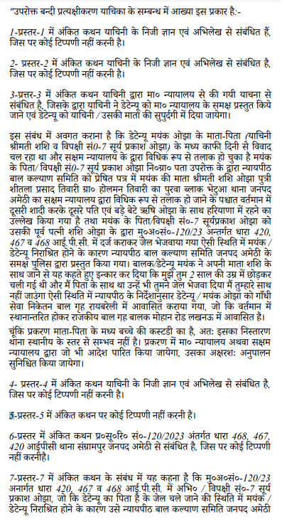 "I. Issue a writ or order in the nature of Habeas Corpus is direct the opposite party no. 2 & 3 to produce the corpus of the petitioner Mayank Ojha aged about 11 years Son of Surya Prakash Ojha before this Hon'ble Court he may be released from the illegal and unjustified custody and detention of the opposite party no.2 and 3 and in case if the opposite party no.2 and 3 failed to ensure the production of the corpus of the petitioners to directed the opposite party no-2 to 6 to ensure the production of the petitioner before this Hon'ble Court on date fixed by the Hon'ble Court and after recording her free statement, he may be released from the illegal and unjustified custody and detention of the opposite party no.2 and 3 and give the custody of her mother of the petitioner.