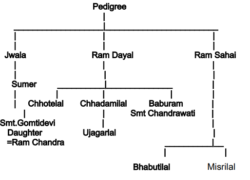 2.The brief facts of the case are that dispute relates to plots of Khata Nos. 107, 382, 417, 419, 421. In the basic year of the Consolidation operation khata No.107 was recorded in the name of Bhabuti Lal and Misrilal, sons of Ram Sahai, Babu Ram, Chhadamilal and Chhotelal, sons of Ram Dayal and Jalim son of Bhuppi, khata No.382 was recorded in the name of Baburam, Chhadami Lal and Chhote Lal sons of Ram Dayal, Khata No.417 was recorded in the name of Bhabutilal and Misri Lal sons of Ram Sahai, Khata No.419 was recorded in the name of Bhabuti Lal, Misri Lal sons of Ram Sahai and Baburam, Chhadamilal and Chhotelal sons of Ram Dayal and Khata No.421 was recorded in the name of Bhabuti Lal and Misri Lal sons of Ram Sahai and Babu Ram and Chhadami son of Ram Dayal. The family pedigree which is mentioned in paragraph No.2 of the writ petition will be also relevant for perusal, which is as under: