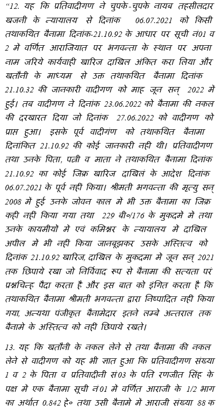 3. Brief facts of the case are that the Original Suit No. 574 of 2022 was instituted by the plaintiff/respondents against defendant/petitioners for cancellation of sale deed dated 21.10.1992 executed by Smt. Bhagwanta in favour of Ranjit Singh son of Rajendra Singh. The plaintiff also claimed cancellation of another sale deed executed by Smt. Bhagwanta in favour of one Shashi Prabha. The relief of mandatory injunction was also claimed by the plaintiff restraining the defendants not to interfere with the possession of the plaintiff over the land in dispute. After being noticed,