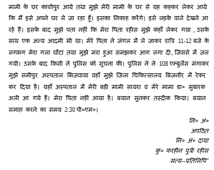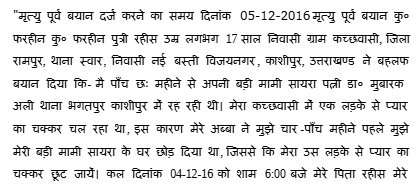 2. The case was initiated with the lodging of a First Information Report on 5.12.2016 at 14:50 hours. The first informant, namely, Ahmad Ali @ Nanhe had in the FIR stated that his Bhanji (sister's daughter) a few days earlier had fallen in love with a neighbour's son which was not liked by Rahisa the husband of the sister Fatima. Even though the case had resulted in a settlement, the husband of the sister of the first informant was very cross with his daughter and therefore, because of this incident, the first informant had brought his niece to his house at Kashipur where she stayed for around 4 months. In the FIR, it has been stated that on 4.12.2016 at 6:00PM Rahisa the husband of the sister of the first informant came to the house of the first informant and told him that some people were coming to see his daughter in connect