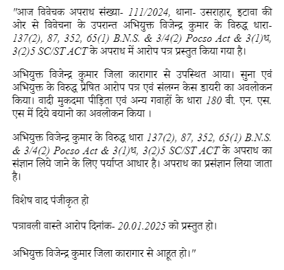 2. Sri Divyanshu Pathak, learned counsel for the accused-applicant appears and submits that he does not want to file rejoinder affidavit in reply to the counter affidavit filed by the State as well as the opposite party no.4. He submits that sole ground of moving the present application under Section 528 B.N.S.S. is the framing of charge by the trial court without the mandatory compliance of Section 230 B.N.S.S., which mandates that the copy of police report and other documents shall be provided to the accused-applicant and further submits that the order of taking cognizance dated 06.01.2025 passed by the Special Judge POCSO Act, Etawah in Special Case No.22 of 2025 (State of U.P. Vs. Vijendra Kumar), arising out of Case Crime No.111 of 2024, under Sections 137(2), 87, 352, 65(1) B.N.S. and Sections 3/4(2) of POCSO Act as well as Sections 3(1)Dha, 3(2)5 of S.C./S.T. Act, Police Station Usarahar District Etawah, has not made any mention in the order