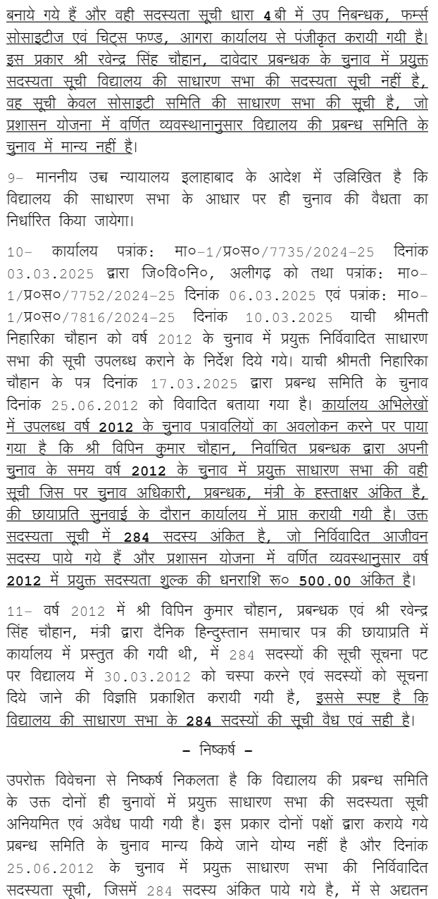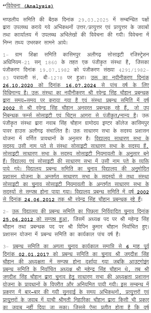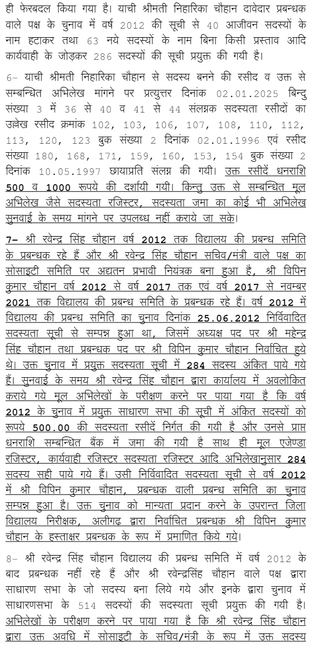 1. Present writ petition is filed by Committee of Management of Nawab Singh Chauhan Gramodaya Inter College, Aligarh through its Manager (Smt. Niharika Chauhan) whereas respondent-4 (Ravindra Singh Chauhan) has also claimed that he was the elected Manager of said Committee of Management.