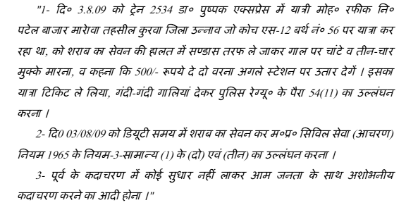2. It is the case of the petitioner that he was a Constable in GRP Chowki, Habibganj on 03.08.2009. His duty was fixed in Musafirkhana Reservation Office from 20.00 hours to 08.00 hours. It is alleged that during his duty hours on 03.08.2009 while coming to Habibganj from Itarsi in train No.2534 Pushpak Express the petitioner demanded Rs.500/- from passenger of Coach S-12, Berth No.56, named Rafiq, R/o Patae Bazar, Morava, Tehsil Kurwa, District Unnav (U.P.). It was further alleged that the petitioner punched and slapped the said passenger and used filthy language and moreover he snatched the ticket of the said passenger. The FIR of the said incident was lodged in GRP Thana Bhopal after taking Dehati Nalishi of Raffiq by Additional Sub-Inspector-M.P. Thakkar going to resident of complainant Rafiq. Thereafter, criminal case at Crime No.377/09 for offence under Sections 323 , 294 and 327 of IPC was registered against the petitioner on 07.08.2009.