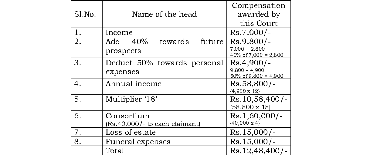 The court ruled on proper compensation calculations for death in a motor accident, emphasizing the relevance of accurate income assessment and recognition of future prospects and dependents’ loss.