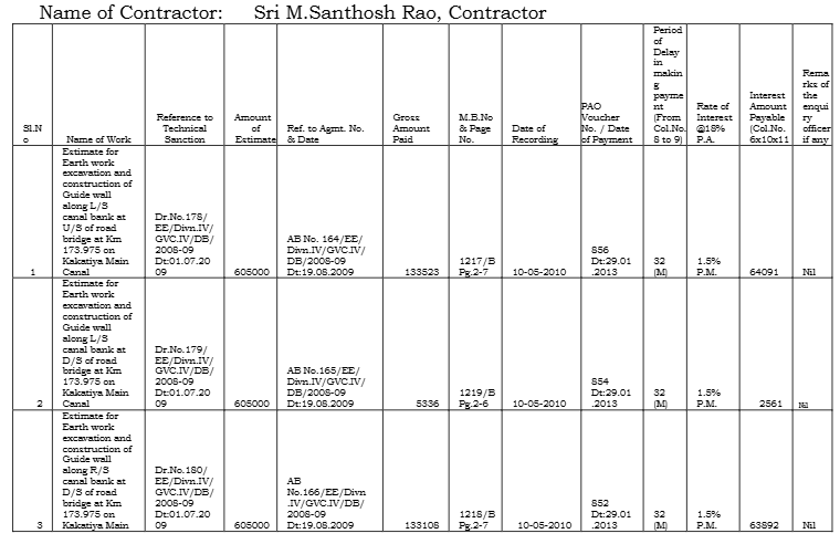 STATEMENT SHOWING THE LIST OF WORKS CARRIED OUT BY M.SANTHOSH RAO, CONTRACTOR ON WHICH INTEREST PAYABLE FOR THE DELAY CAUSED ON THE PART OF DEPARTMENT