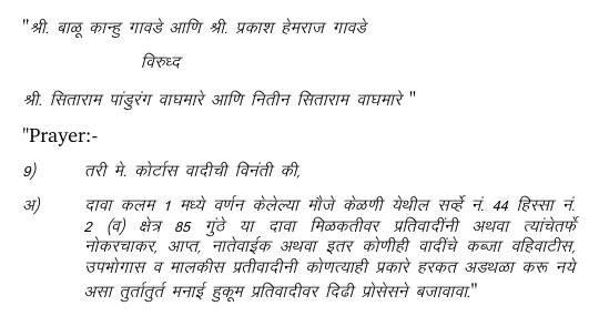 2. RCS No.537 of 2012 has been filed on 05.03.2012 by Respondent Nos.1 and 2 being the plaintiffs therein against the Petitioner No.1 and his father before the Civil Judge, Senior Division, Kalyan for injunction in respect of suit property bearing Survey No.44 Hissa No.(2b) ad-measuring 85 gunthas situated at Taluka Kalyan, District Thane.