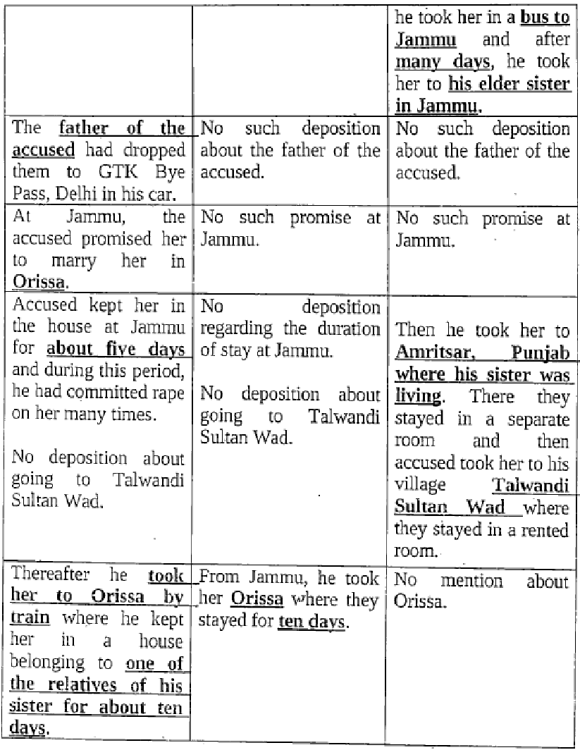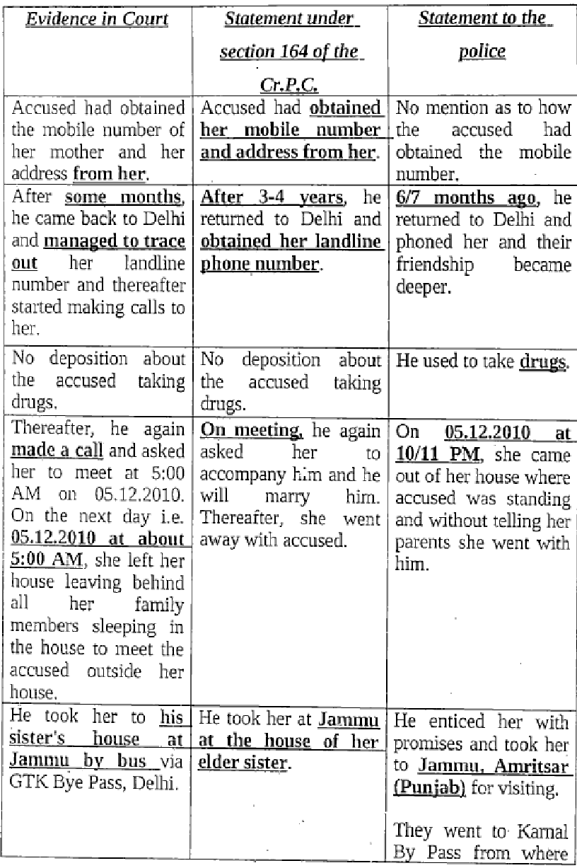 4. The allegation in the present case was that around 05:00 A.M. on 5th December, 2010, near RZF-80, Nihal Vihar, Delhi, the Accused had kidnapped the Prosecutrix from the guardianship of her parents and had committed rape upon her. The incidents are stated to have occurred at two places i.e., Jammu and Amritsar between January to March, 2011. The char