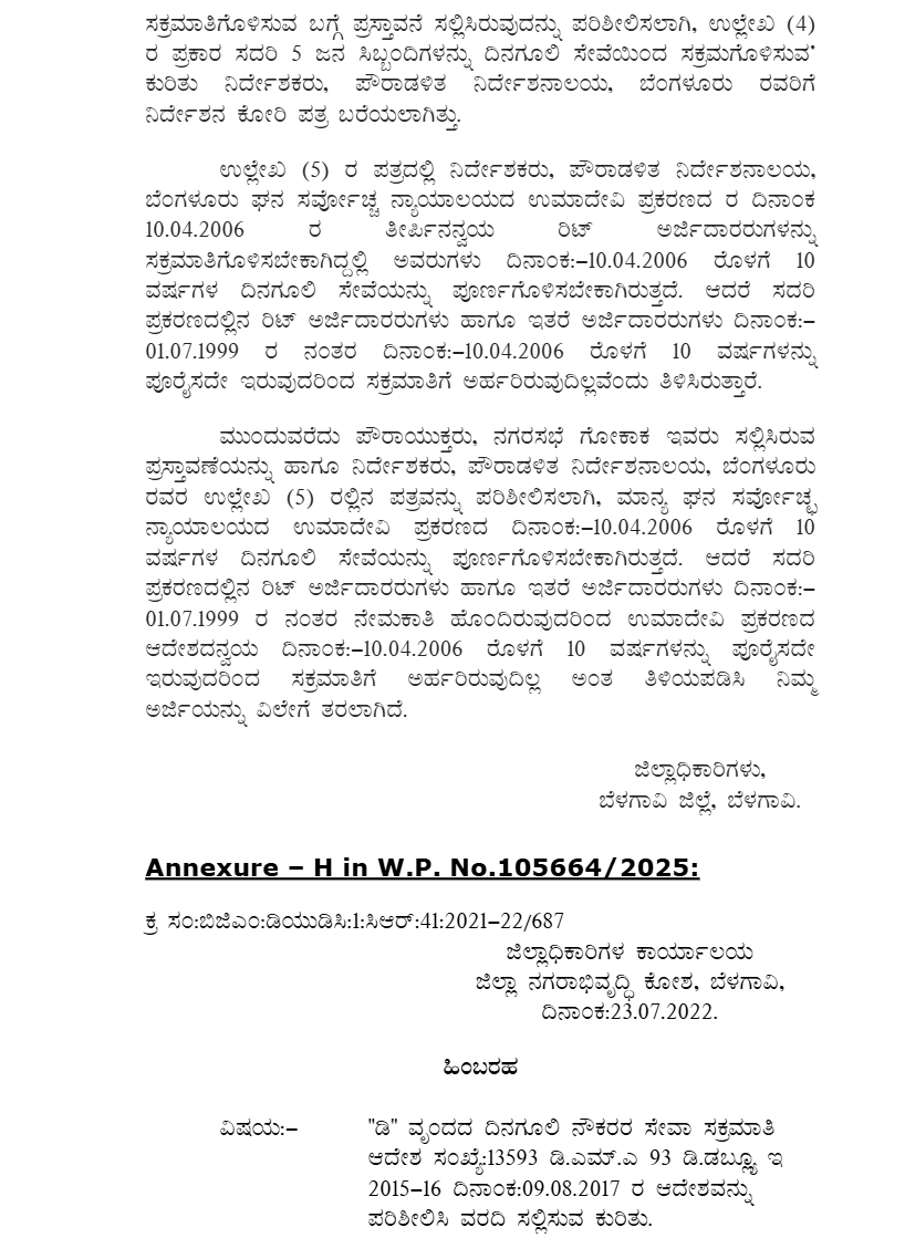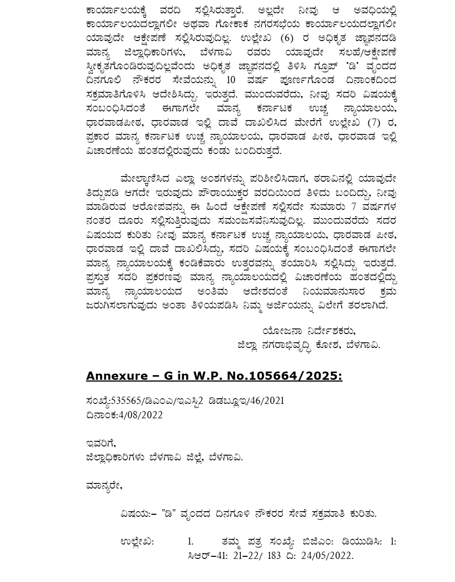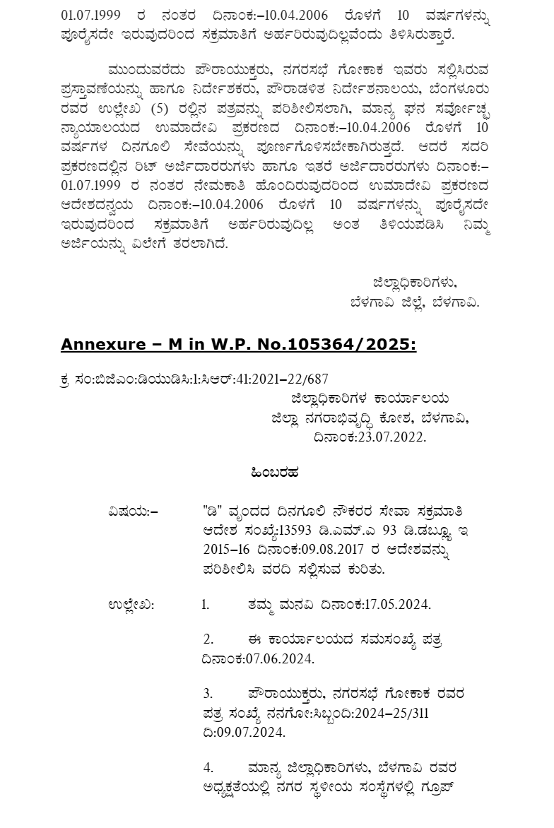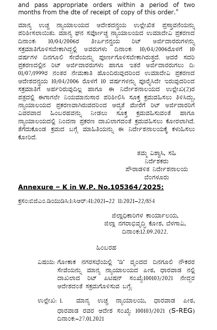 1. The petitioners in W.P. No.105364/2025, four in number and the petitioner in W.P. No.105664/2025, one in number, are at the doors of this Court calling in question an endorsement dated 04.08.2022, by which the claim of these petitioners seeking regularisation of their services has been turned down. The consequential direction to regularise the services of the petitioners after completion of ten years from the date of their initial appointment, is sought.
