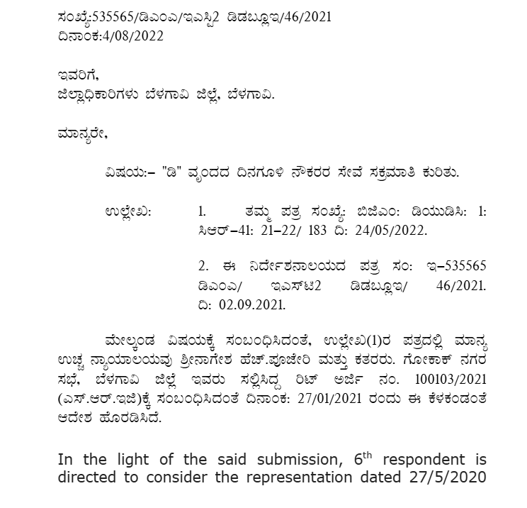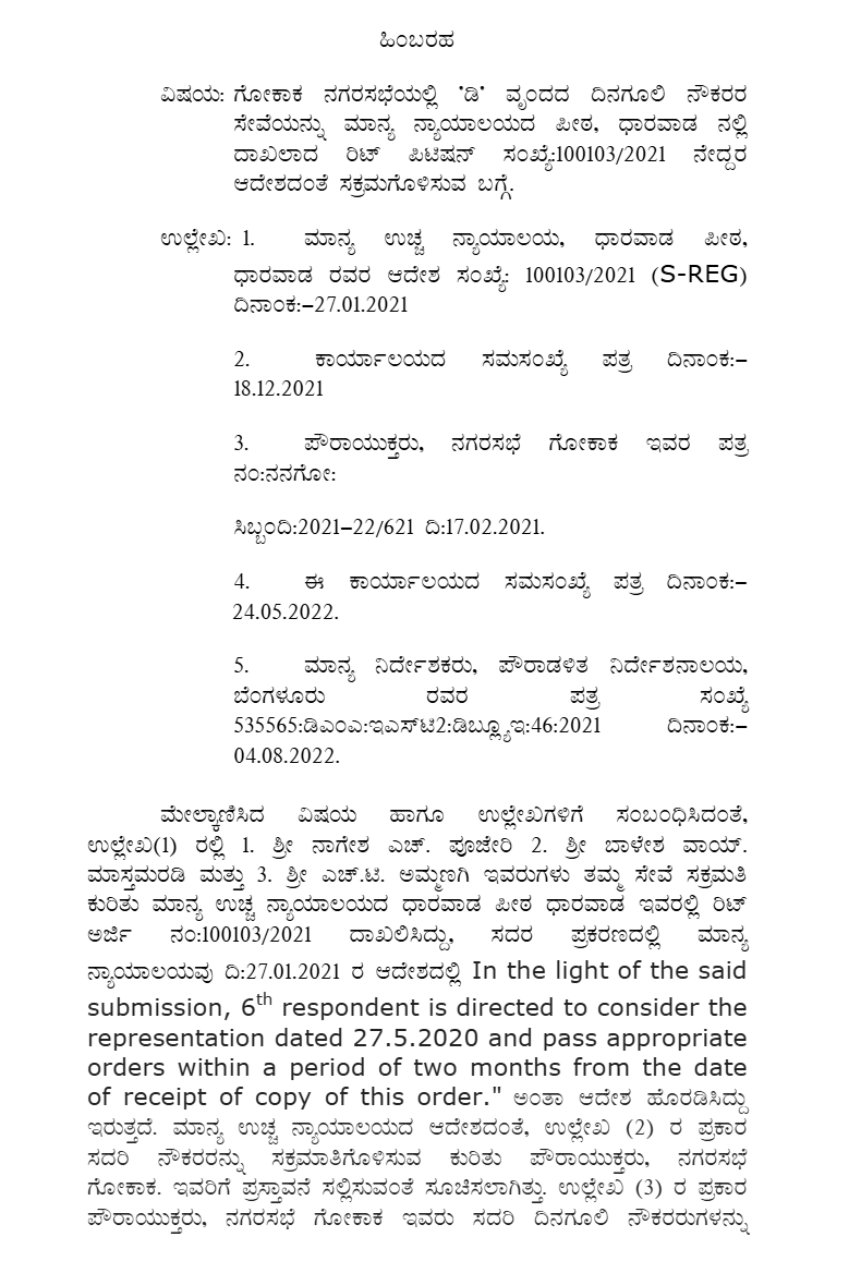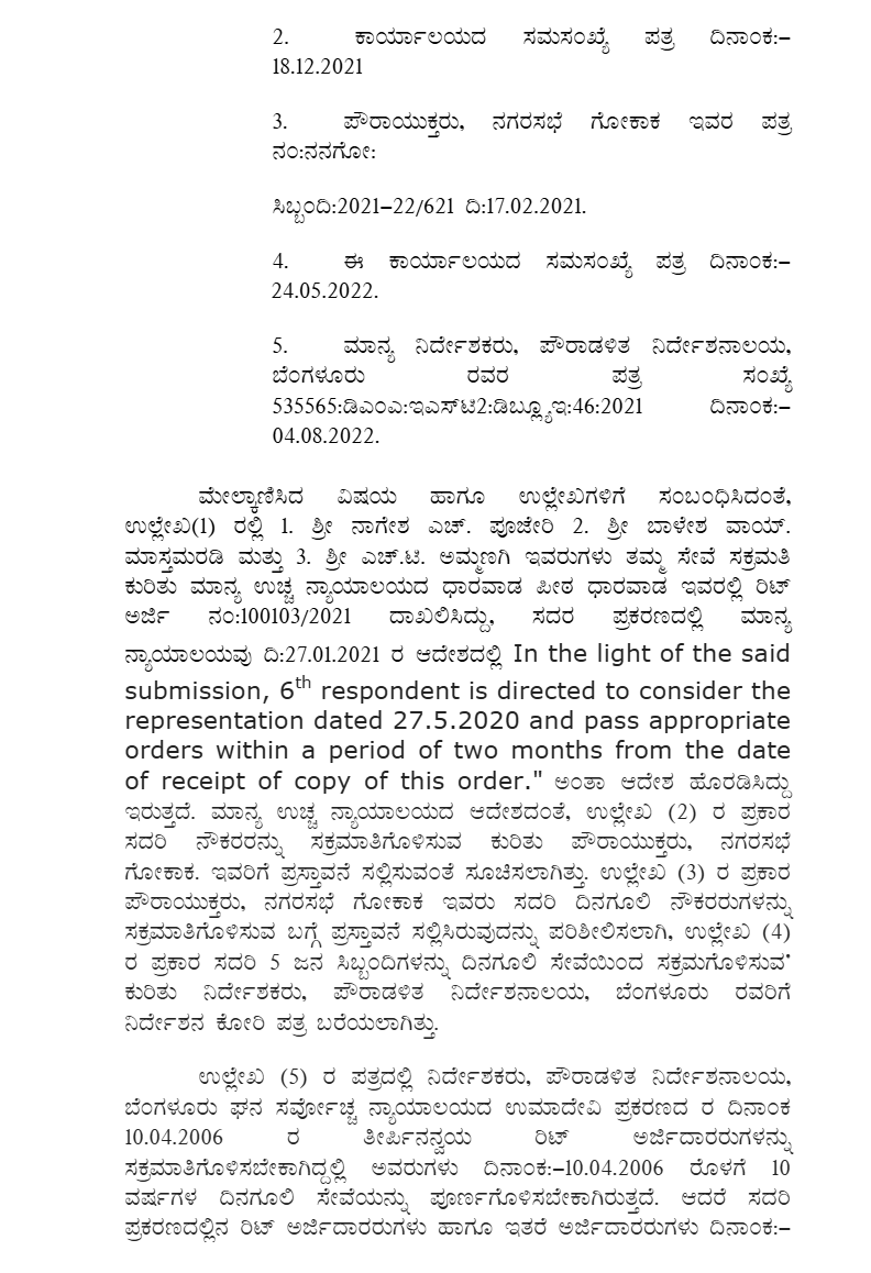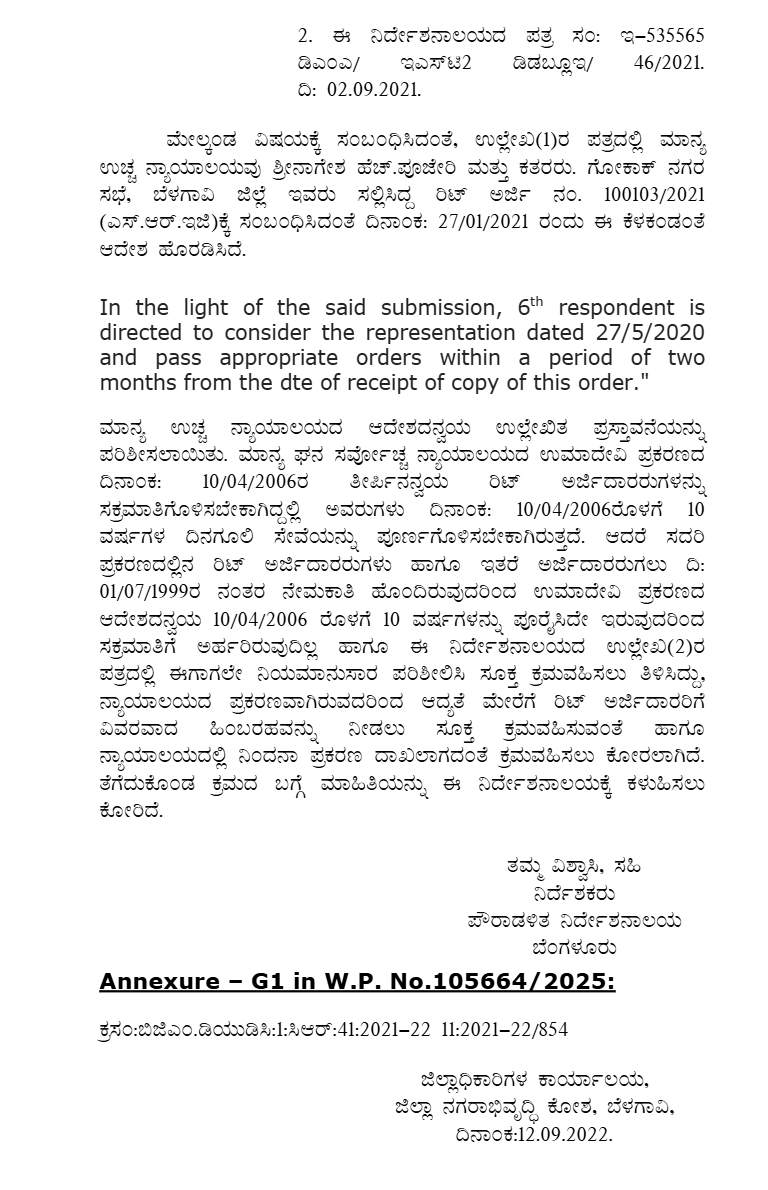 1. The petitioners in W.P. No.105364/2025, four in number and the petitioner in W.P. No.105664/2025, one in number, are at the doors of this Court calling in question an endorsement dated 04.08.2022, by which the claim of these petitioners seeking regularisation of their services has been turned down. The consequential direction to regularise the services of the petitioners after completion of ten years from the date of their initial appointment, is sought.