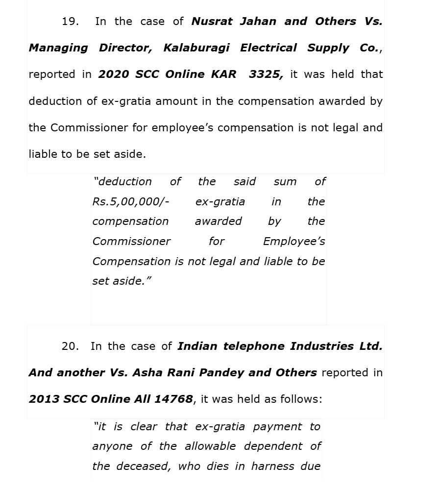3. Aggrieved by the said award, the Insurance company has preferred these appeals. The learned counsel for appellant-insurance company contended that the petitioners received amount from the Government of Karnataka contributed by Hindustan Petroleum Corporation Ltd. (HPCL) and disbursed through Deputy Commissioner as ex-gratia compensation for the shop damage/accidents due to the fire accident arising out of the use of the LPG tankers bearing No.KA-01-AC-6600. It is contended that the Tribunal ought to ha