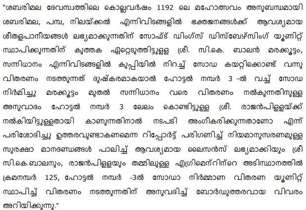 The petitioner, who is a Kuthaka holder in respect of Kuthaka item No.136 in the list of Kuthaka items, which forms part of the e-tender notification dated 19.07.2024 issued by the additional 5th respondent Devaswom Commissioner, Travancore Devaswom Board, in respect of Sabarimala Devaswom, for the year 1200ME (2024-25), who has been issued with Ext.P7 Kuthaka certificate No.196/24 dated 15.11.2024 by the 3rd respondent Executive Officer, Sabarimala, has filed this writ petition invoking the writ jurisdiction of this Court under Article 226 of the Constitution of India , seeking a writ of mandamus commanding the 2nd respondent Travancore Devaswom Board and the 3rd respondent Executive Officer to grant him permission to operate a soda manufacturing and distribution unit during Mandala- Makaravilakku festival season of 1200ME (2024-25) and to issue necessary order, licence or permit without any delay. The petitioner has also sought for a writ of mandamus commanding the 2nd respondent Board to consider Exts.P4 and P5 applications dated 17.11.2024 and Ext.P6 application dated 20.11.2024, after affording him an opportunity of being heard, within a time lim