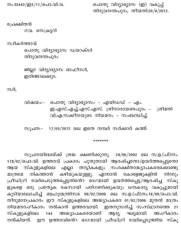 The petitioner was appointed as H.S.A. (Malayalam) by the fifth respondent Manager by Ext.P1 appointment order dated 18.6.2004 in M.E.S. Higher Secondary School, Sreenarayanapuram, against an additional division vacancy sanctioned for the academic year 2004- 2005. At the time of appointment, the petitioner possessed a B.A. degree in Economics and a B.Ed. degree in Malayalam awarded by the University of Calicut. The District Educational Officer, Irinjalakkuda declined to approve the said appointment on the ground that the vacancy should have been filled up by appointing a protected teacher. The appeal filed by the Manager before the Deputy Director of Education, Thrissur was rejected. The revision petition filed by the Manager before the Director of Public Instruction was also rejected by order passed on 23.2.2008. The Manager as well as the petitioner thereupon filed revision petitions before the Government.