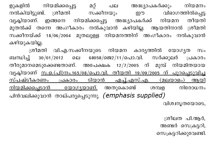2. The petitioner, and another teacher whose appointment as HSA (Malayalam) in the very same school with effect from 25.7.2005 had not been approved, thereafter filed W.P.(C)No.1666 of 2009 in this Court wherein they challenged the orders passed by the authorities declin