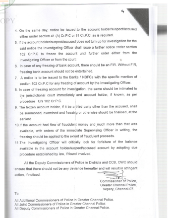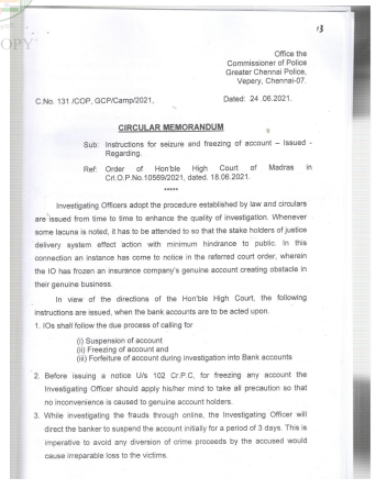 The issue by many of the citizens currently face is the freezing of the account on instruction from the local Police or from the National Cyber Crime Reporting Portal. Many a times, the account holders have been taken into surprise that by such order of freezing, before they could realize as to why and for what purpose the accounts are freezed, enough damages are caused to their day to day financial life, since the very life- line of the business gets severed by such unilateral orders of account freezing passed by the Police.