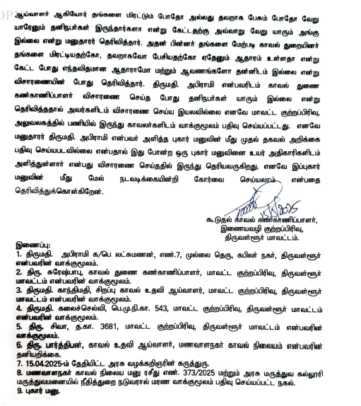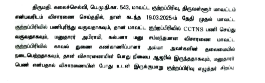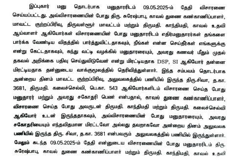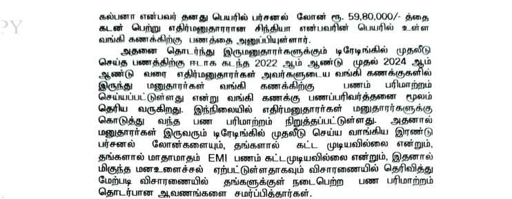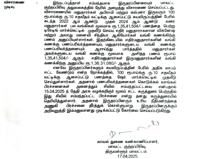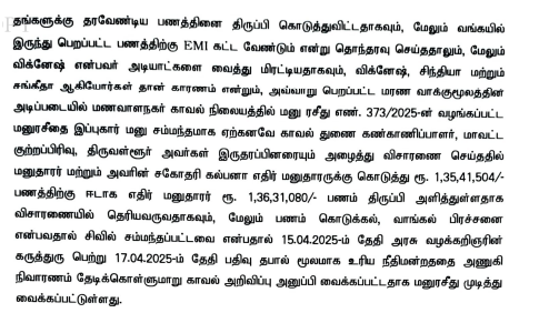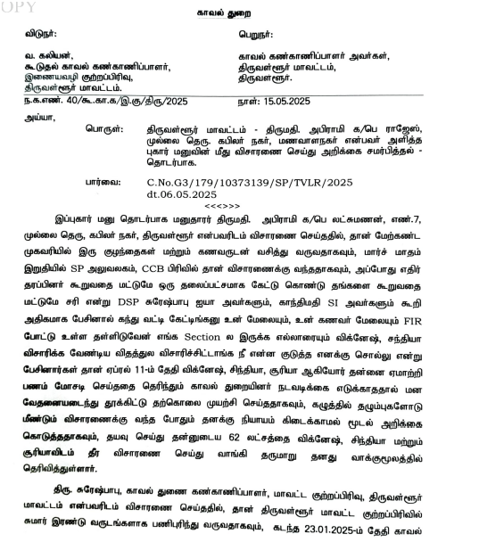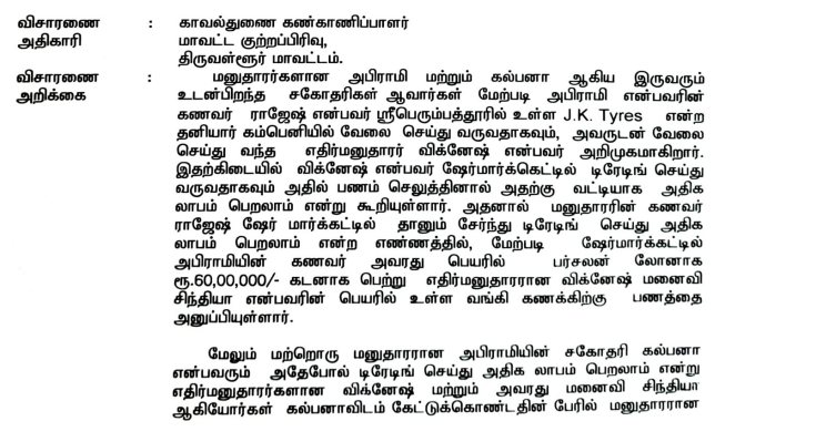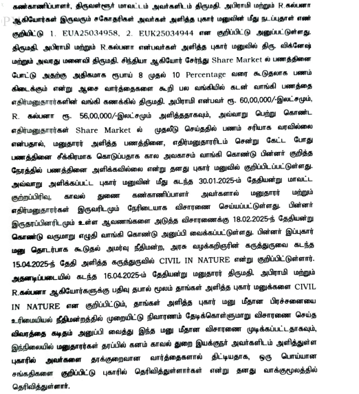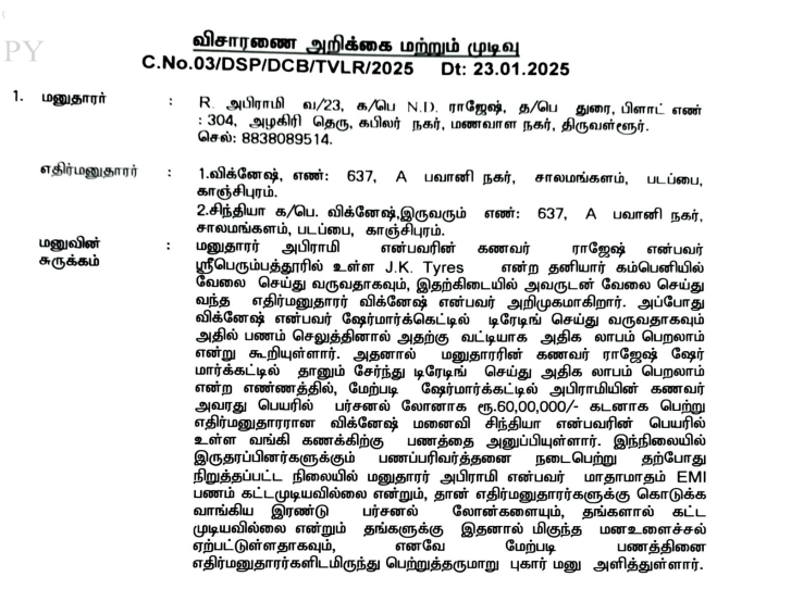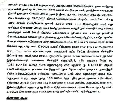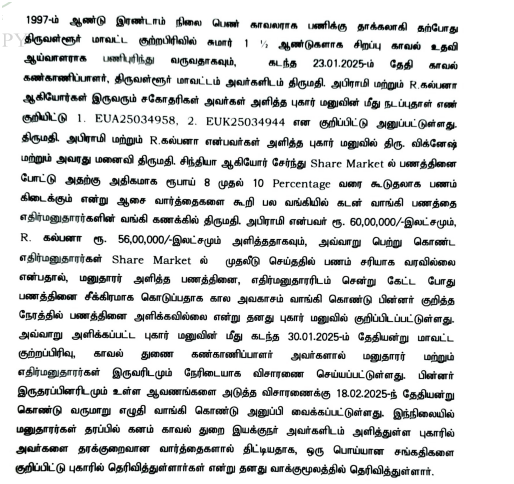 2.The contention of the learned counsel for the petitioner is that the petitioner as complainant lodged a complaint against one Vignesh, his wife Sindhiya and her sister Sangeetha and one Sridhar, who all in a deceitful manner induced the petitioner and her sister to avail personal loan by making arrangements in various Banks through their contacts and forced them to avail personal loan to the tune of Rs.60 lakhs each. These loans were handled by them by transferring to various accounts and thereby cheated and misappropriated to the tune of Rs.1,35,41,504/-, for which, the petitioner lodged a complaint to the District Crime Branch, Tiruvallur. The respondents 3 and 4 conducted enquiry, the petitioner produced all the relevant document, failed to consider the documents and ignoring the same, the respondents 3 and 4 closed the case as civil in nature. When the petitioner requested the respondents 3 an