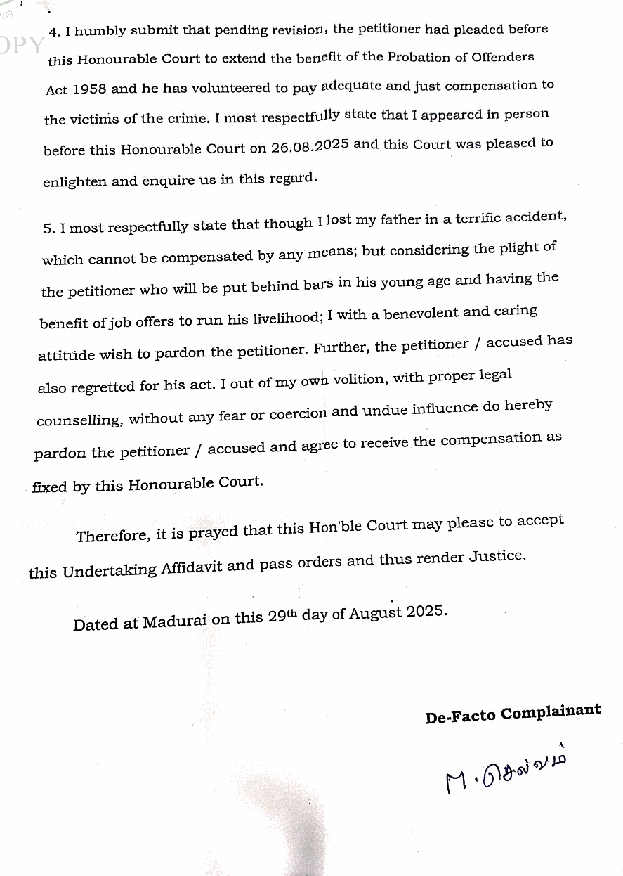 This Criminal Revision challenges the concurrent findings of conviction for the offence under Section 304-A IPC , passed by the learned Judicial Magistrate, Thiruvaiyaru in C.C. No.124 of 2016 by Judgment dated 05.04.2023, as affirmed in Crl.A. No.127 of 2023 by the learned Principal Sessions Judge, Thanjavur, in Judgment dated 09.08.2023. While testing the conviction on the settled parameters of revisional scrutiny, this Court is also invited, on the strength of subsequent developments and legal submissions, to consider extension of probationary relief under the Probation of Offenders Act, 1958 (“hereinafter referred to PO Act”) in exercise of powers under Section 11 thereof.